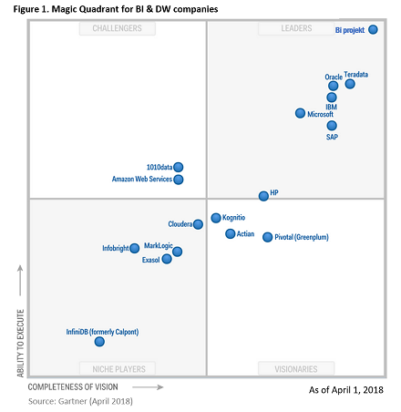 Örömmel jelentjük be, hogy a Gartner vezetőként pozícionálta a BI projektet a szokásos éves elemzésében (Magic Quadrant for BI & DW Expert Companies) Ráadásul idén a BI projekt a legjobbnak bizonyult mind vízióban, mind megvalósítási képességben és ezáltal a legjobb pozícióba, a jobb felső sarokba került: