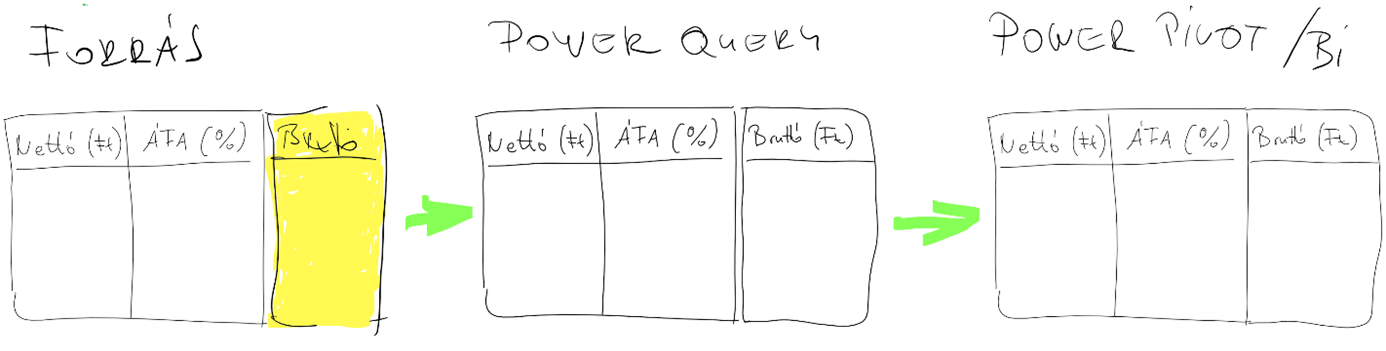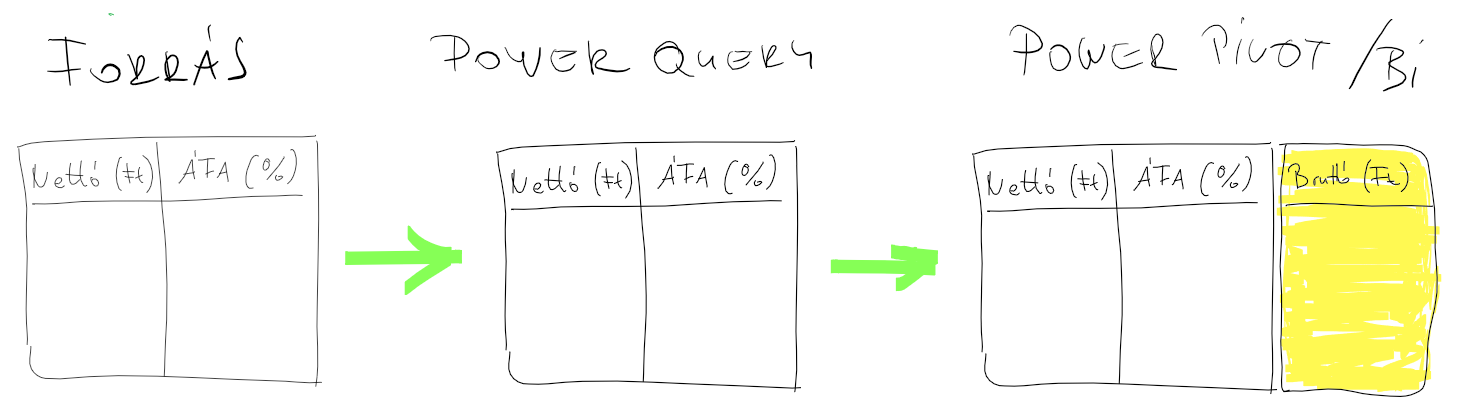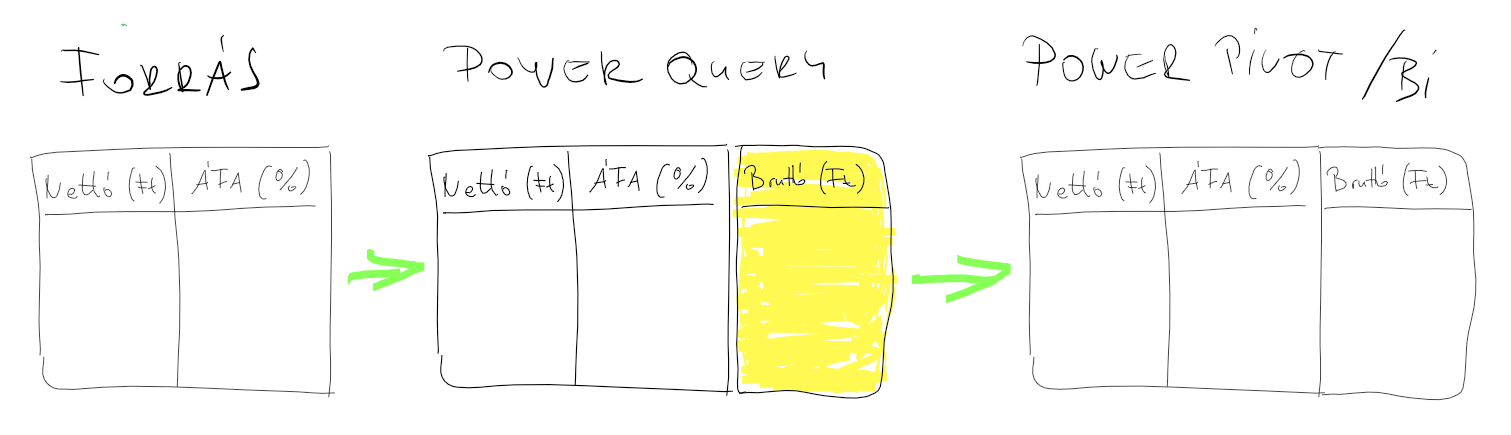 Power Query-ben is úgy, hogy hozzáadunk a forrásadatokhoz egy új oszlopot, ahol kiszámoljuk a bruttó értéket és azt kiszámolva töltjük be a Power BI-ba